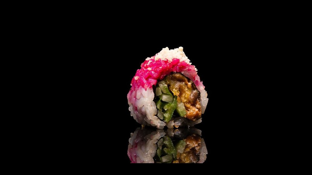 mit Avocado, veganer Kabayaki-Mayonnaise, Curry Panko und veganem Frischkäse