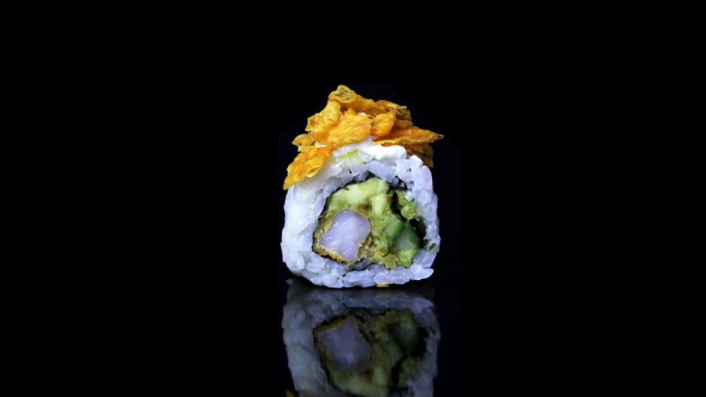 mit Tempura-Garnelen, Gurken, Avocado, Zitronengras, Frischkäse und Tortilla Chips