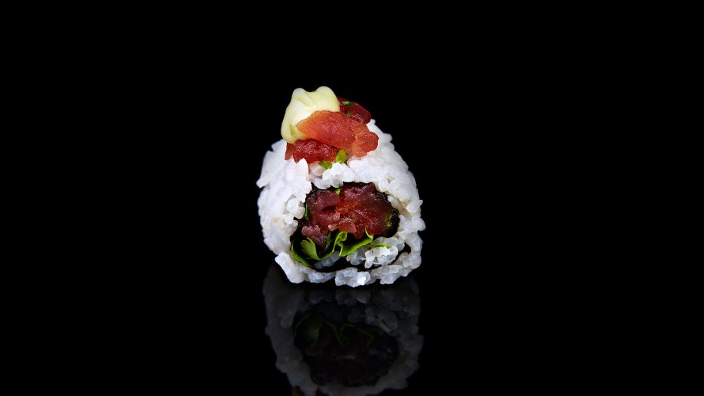 mit veganem Thunfisch, Koriander, Wasabi-Mayonnaise und veganem Thunfisch-Tatar obenauf