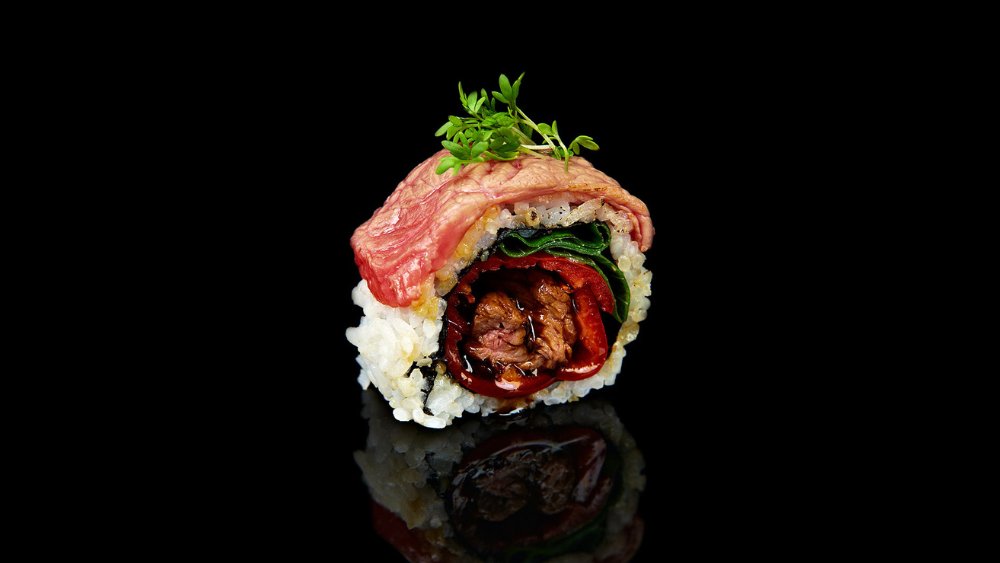 mit gegrilltem Rindfleisch, Paprika, grünem Spargel, Kresse, Teriyaki-Soße und flambiertem Rindfleisch obendrauf