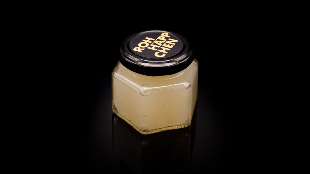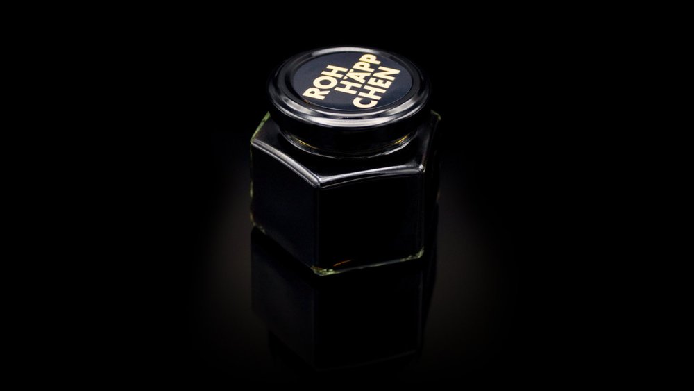 mit veganer Ente, veganer Erdnusssoße, Gurken, Rote -Bete-Saft und Kresse
