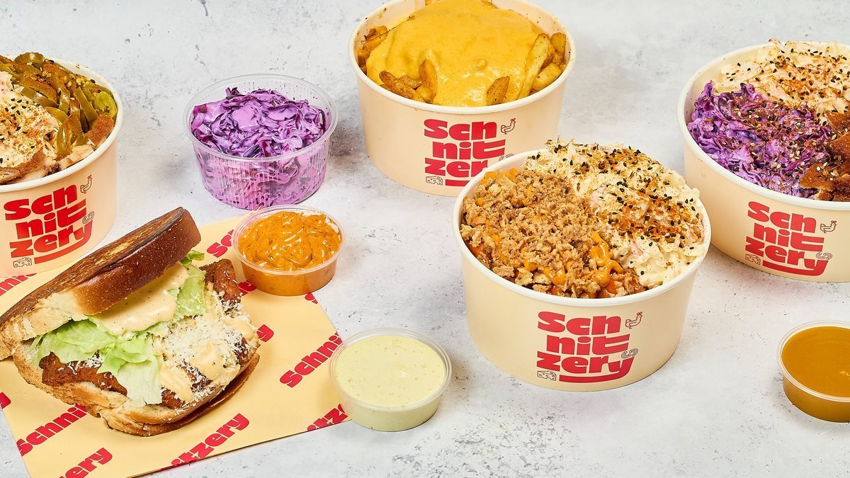 2 panierte Plant-Based Schnitzel und eine Auswahl mit hausgemachten Toppings und Soßen