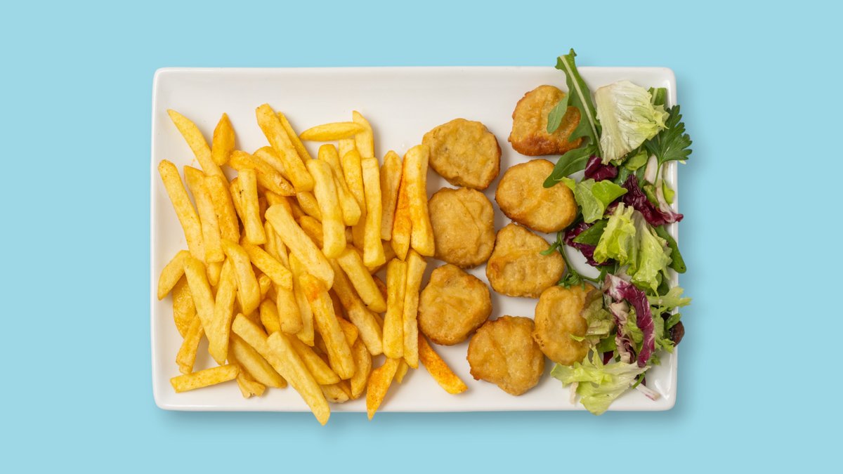 frittierte Currywurststücke im Brot mit Soße und einer Beilage deiner Wahl