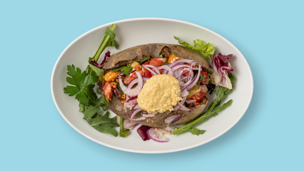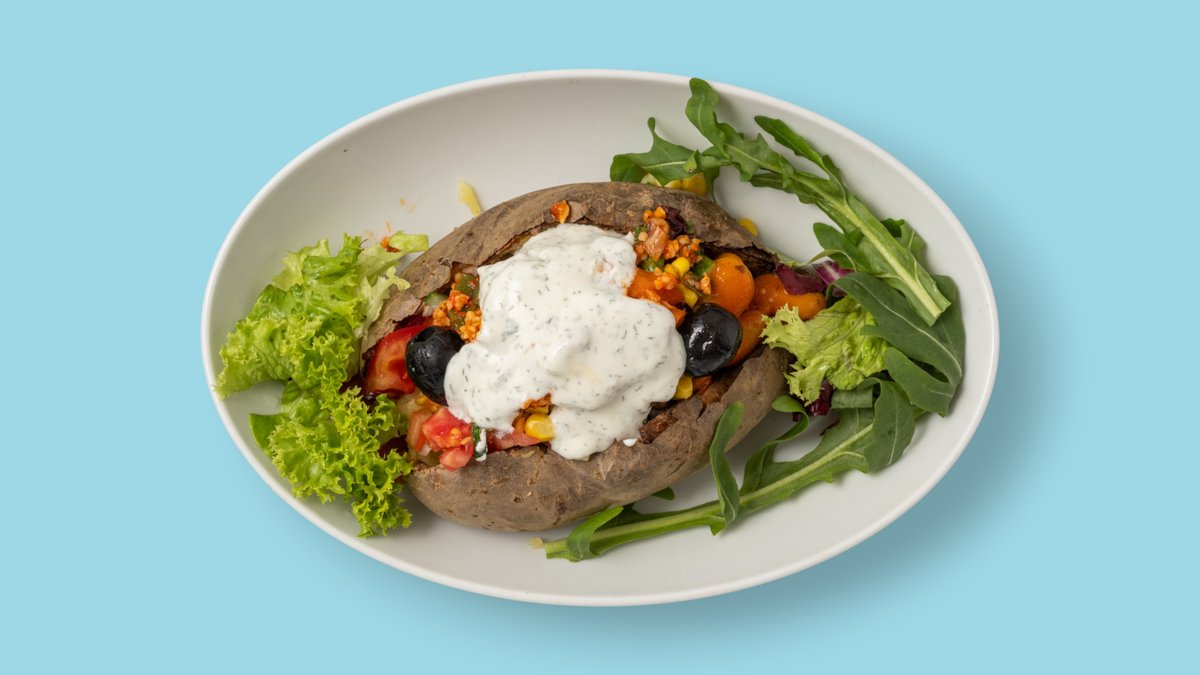 mit Chili-Bohnen, Champignons, Olivensalat, Mais und Sour Cream
