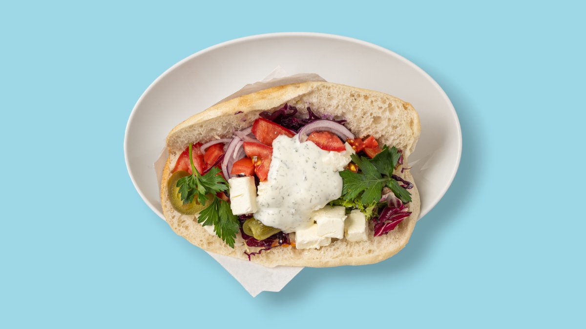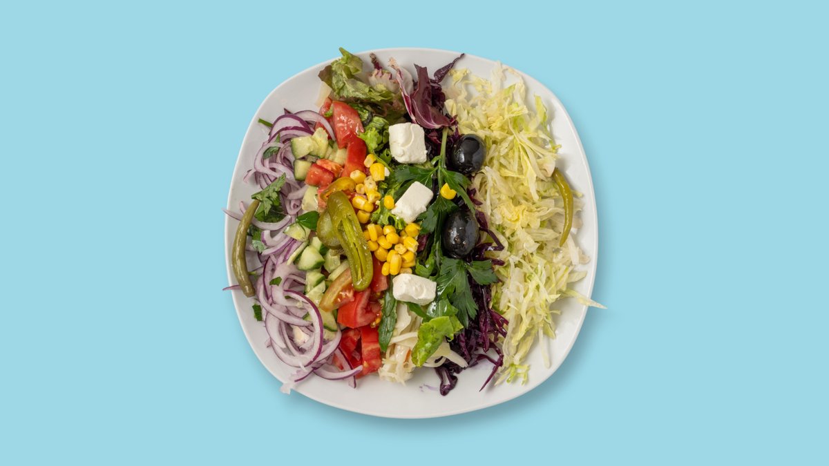 mit Eisbergsalat, Kraut, Gurken, Tomaten, Oliven, Weißkäse und Zwiebeln