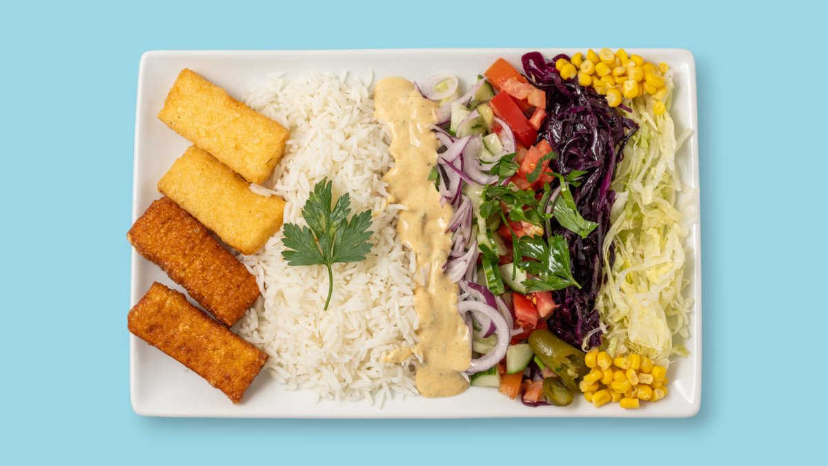 alle Gerichte werden mit frittiertem Halloumi, Salat und Soße zubereitet