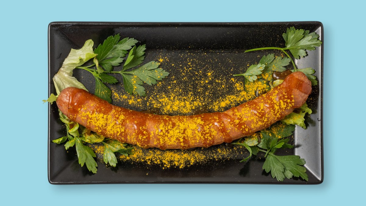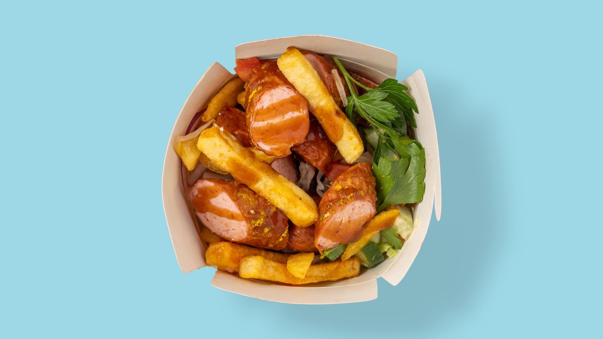 mit frittierter Currywurst vom Rind und Curry-Ketchup