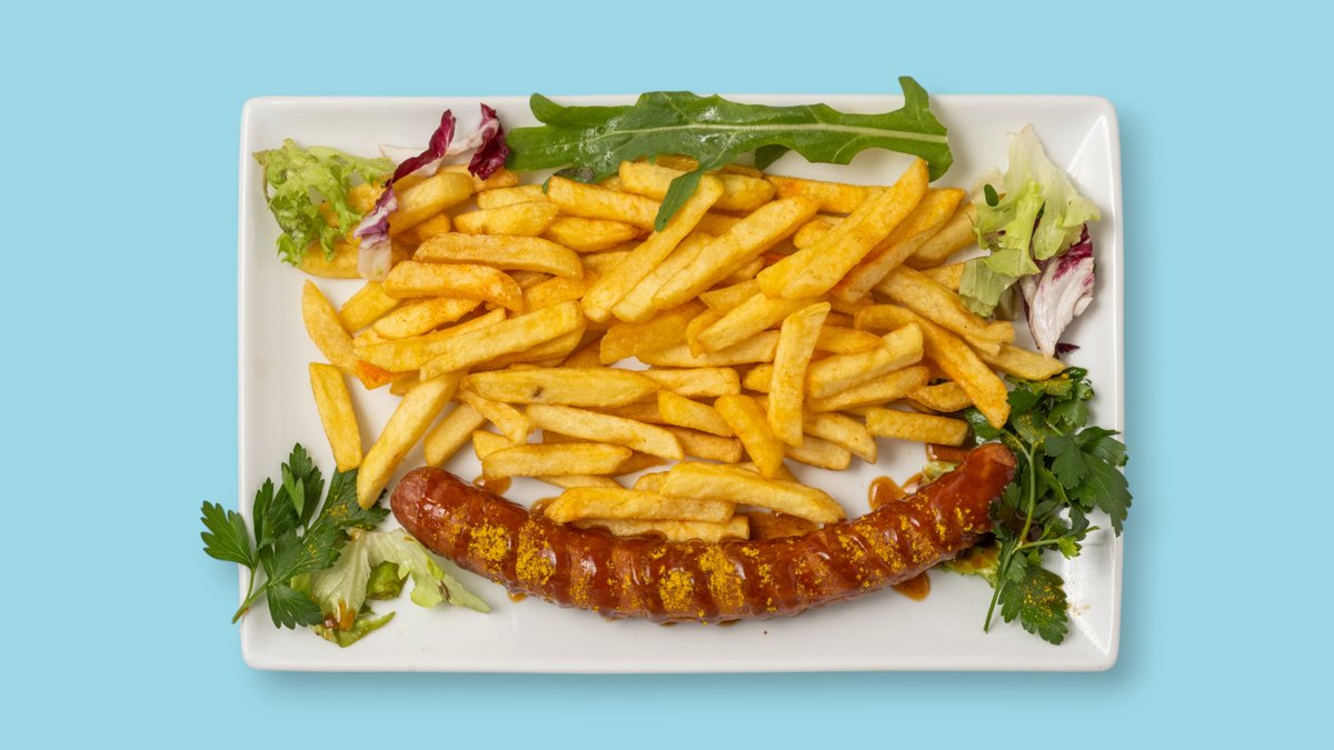 mit frittierter Currywurst, Pommes frites und Curry-Ketchup