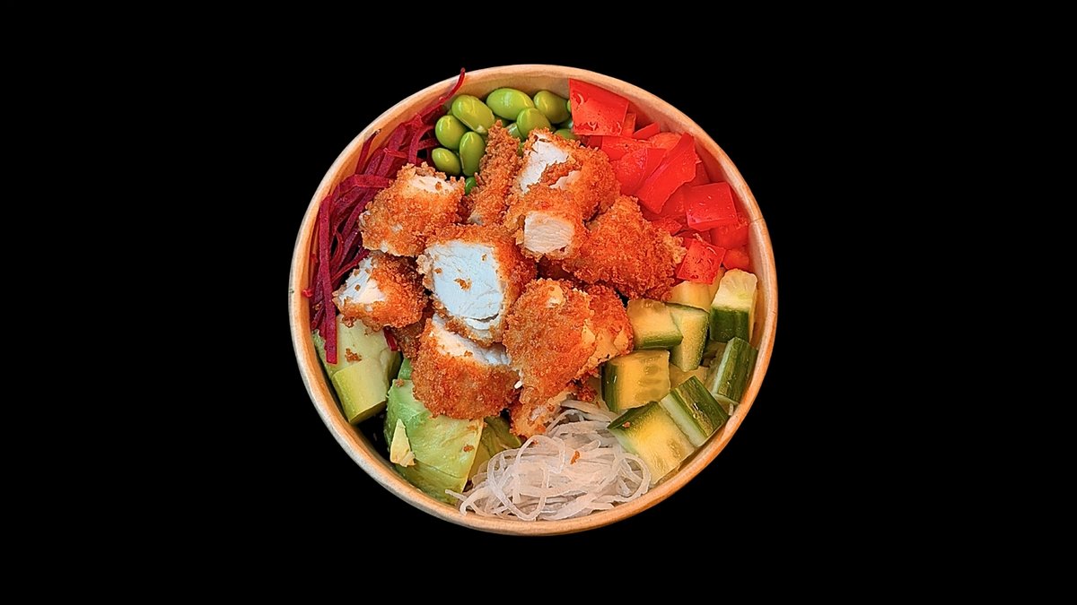 mit Tempura-Hähnchen, Gurken und Lauchzwiebeln