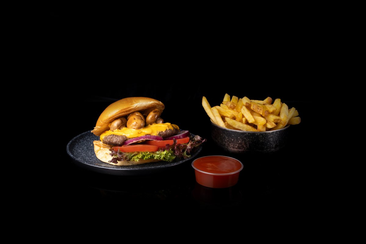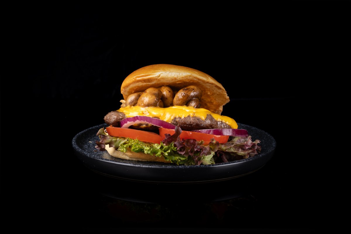 1x Smash Burger-Mushroom mit 2 Scheiben amerikanischer Chester und 140 g Rindfleisch, 1x Beilage deiner Wahl, 1x Soße deiner Wahl