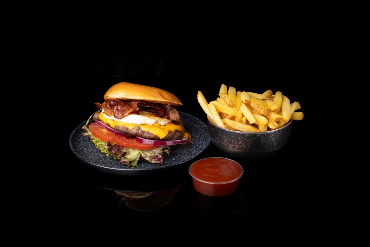 1x Smash Burger-Hillbilly mit 2 Scheiben amerikanischer Chester und 140 g Rindfleisch, 2 gegrillten Speck-Streifen und 1 Spiegelei, 1x Beilage deiner Wahl, 1x Soße deiner Wahl