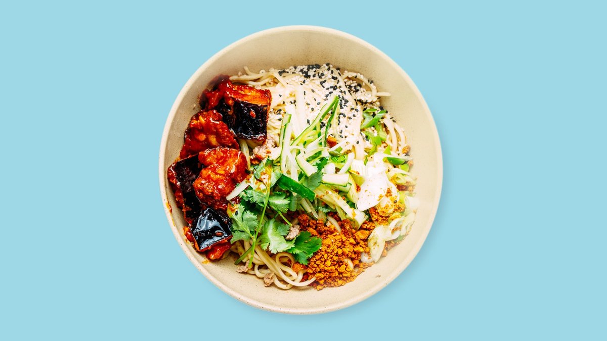 pikant mit hausgemachten Weizennudeln, goldener Sesampaste, Gurken, Erdnüssen, Frühlingslauch, Senf-Pickles und Chili-Knusperöl