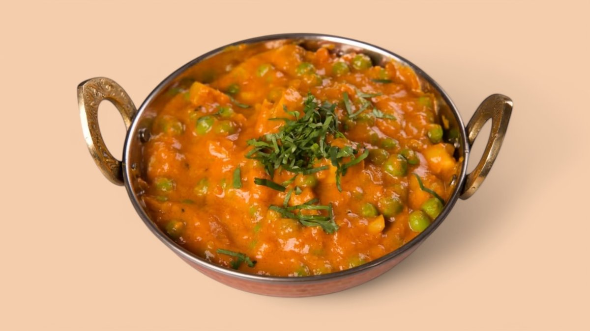 Paneer-Würfel und grüne Erbsen in würziger, aromatischer Tomatensoße mit indischen Gewürzen