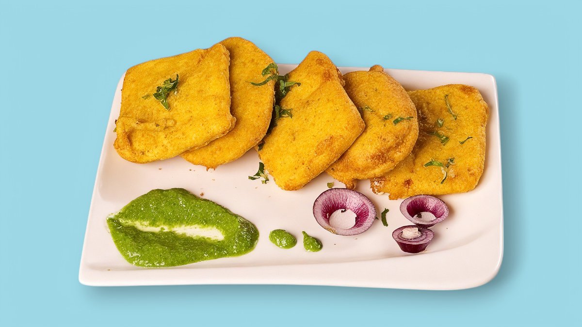 5 Stück würzige Paneer-Würfel in einer knusprigen Kichererbsenmehlpanade, frisch frittiert