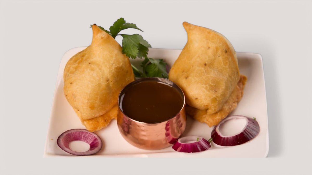 2 Stück krosse Teigtaschen gefüllt mit einer würzigen Mischung aus Gemüse und aromatischen Gewürzen