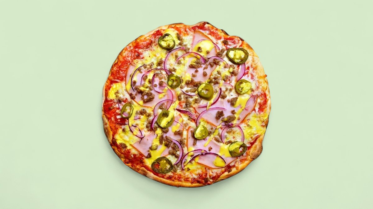 mit Putenbrust, Rinderhackfleisch, Jalapeños, roten Zwiebeln und Sauce Hollandaise