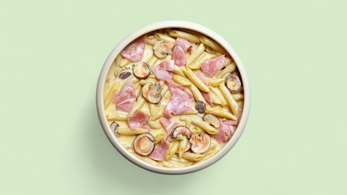 mit Käse-Sahne-Soße, Rinderschinken und Champignons