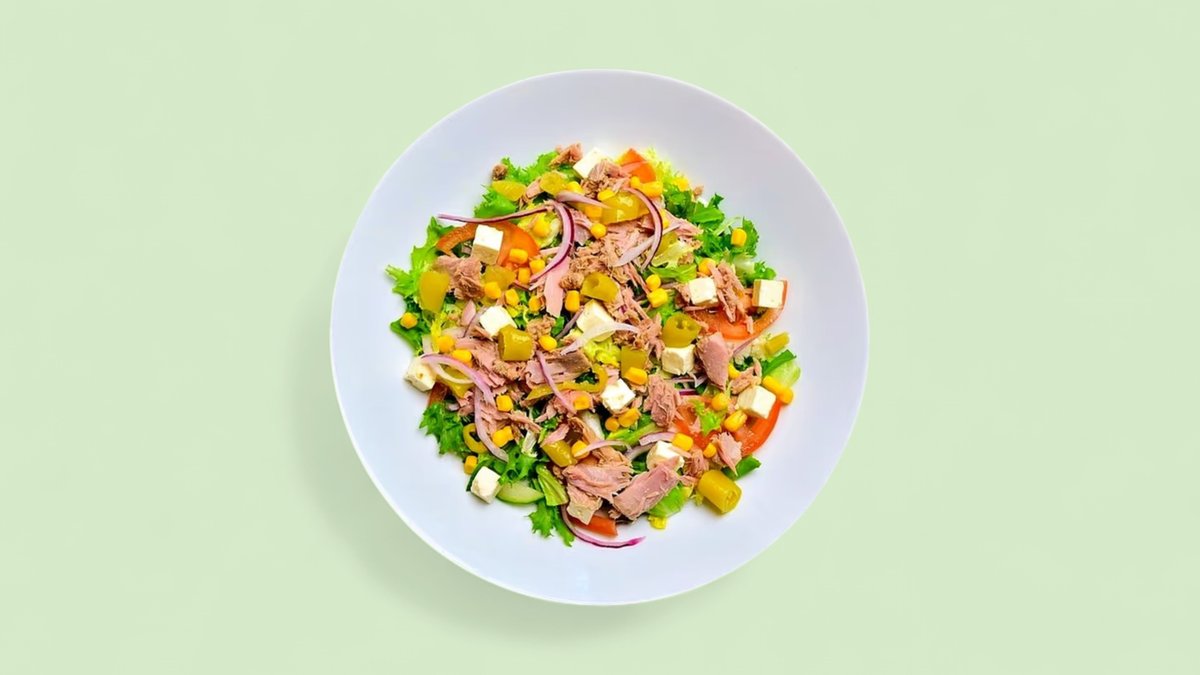 mit Salatmix, Thunfisch, roten Zwiebeln, Tomaten, milde Pfefferoni, Hirtenkäse, Mais und Zitronen-Vinaigrette