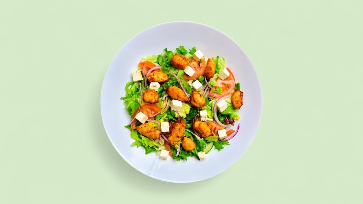 mit Salatmix, Hähnchenbruststreifen, Tomaten, Zwiebeln, Hirtenkäse, Lemon Chili Pepper und Zitronen-Vinaigrette