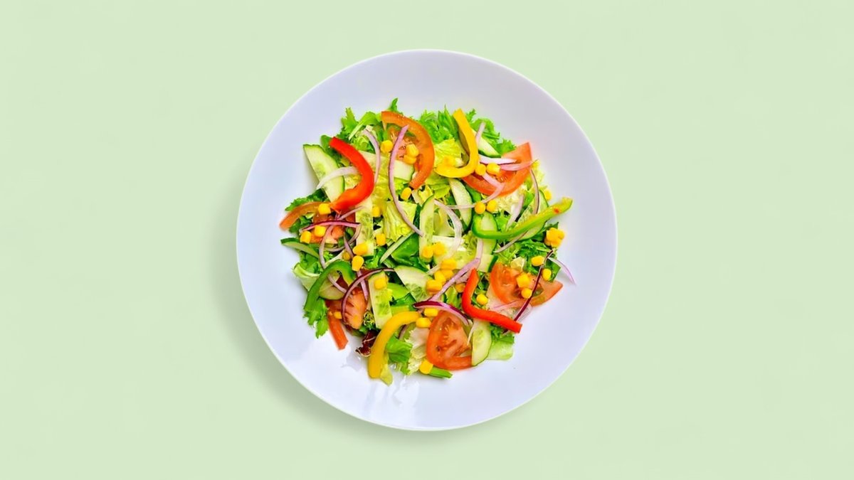 mit Salatmix, Tomaten, Gurken, roten Zwiebeln, Mais, Paprika und Zitronen-Vinaigrette
