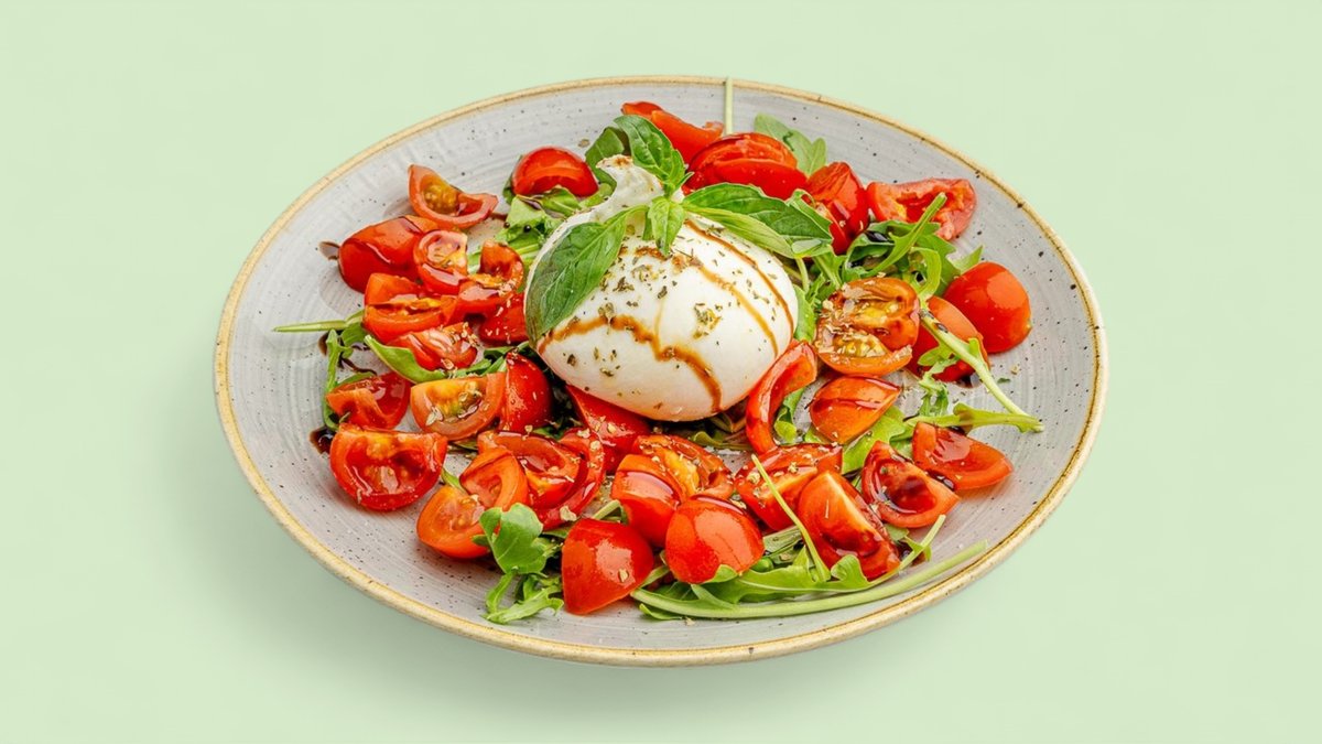 Genießen Sie unseren Burrata Antipasti - mit frischer Burrata, Kirschtomaten, Basilikum und einer Balsamico-Creme.