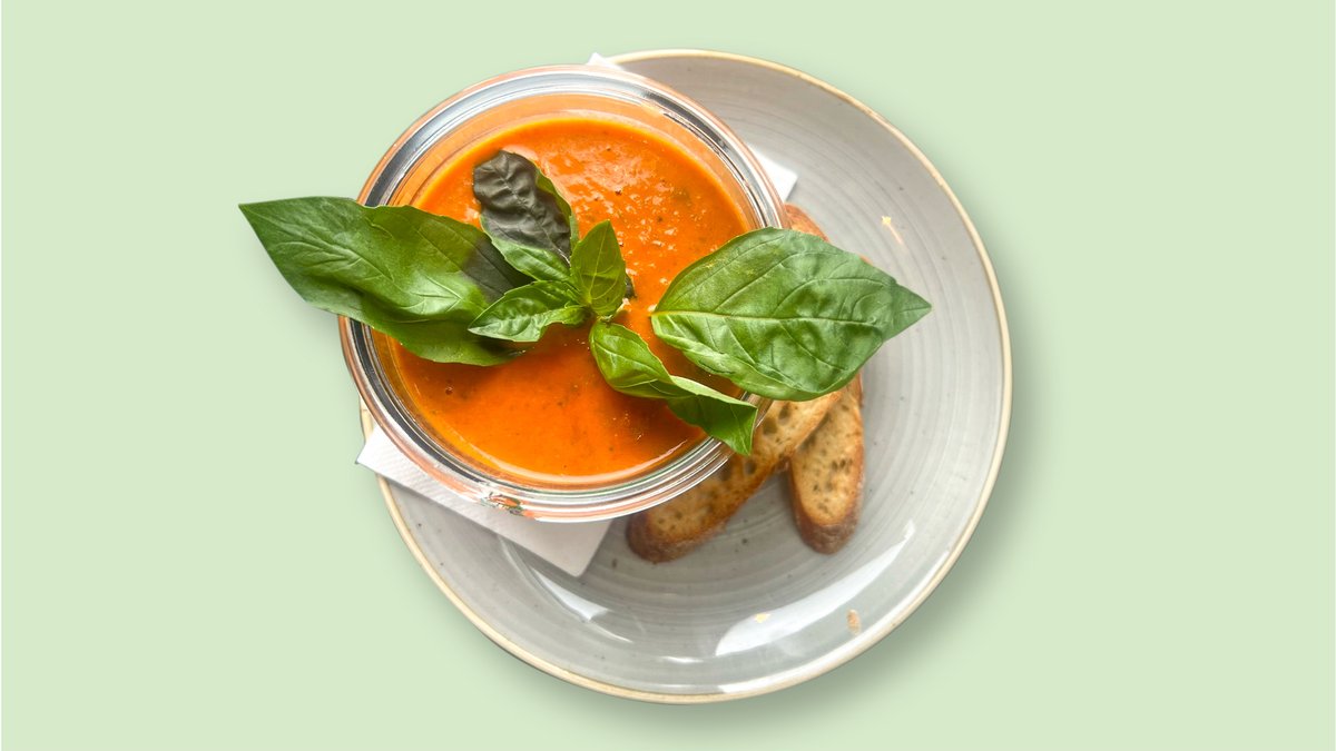 Erleben Sie unsere Crema Pomodoro, eine köstliche Tomatensuppe aus frischen Tomaten, serviert als Antipasti. Perfekt als Starter.