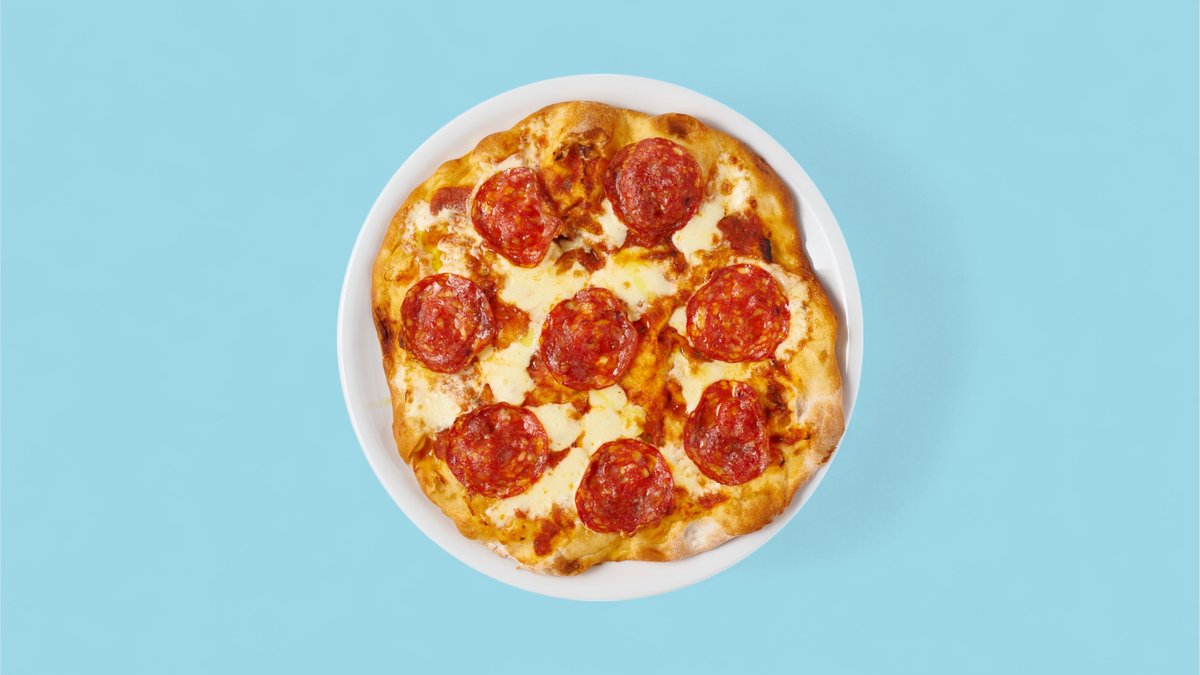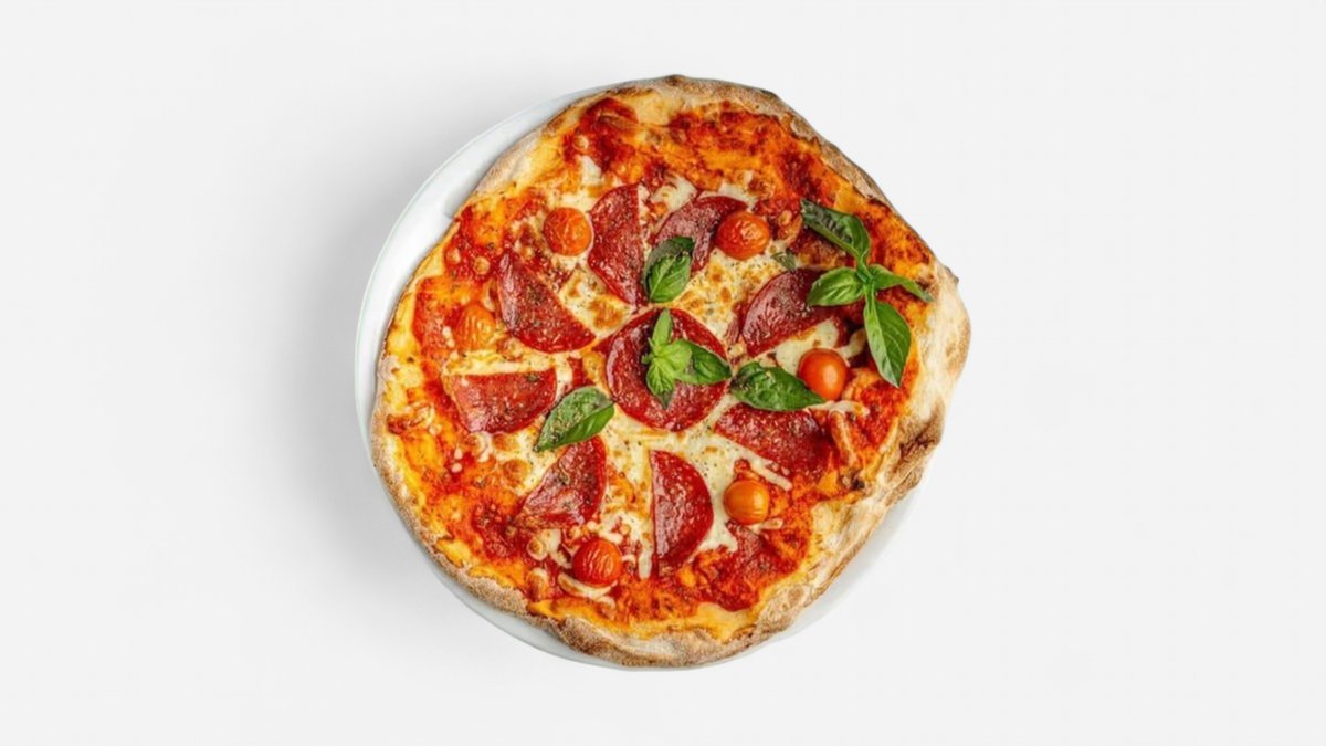 Genießen Sie unsere Salami-Pizza mit herzhafter Salami, cremigem Mozzarella, frischem Basilikum und Tomatensauce.
