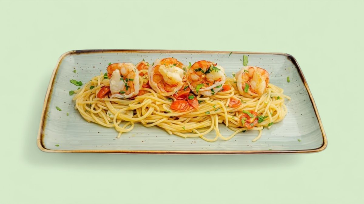 Spaghetti Scampi - Verführerische Pasta mit saftigen Garnelen, aromatischem Knoblauch und frischen Kirschtomaten.
