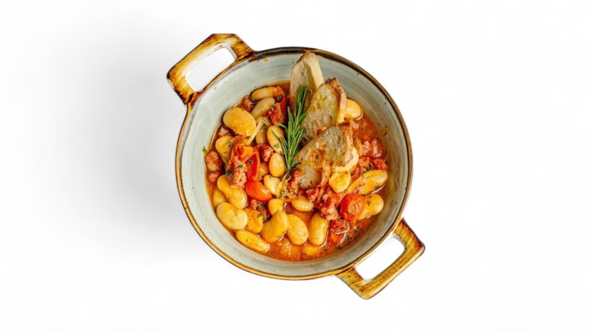 Genießen Sie unsere köstliche Antipasti Salsiccia e Fagioli, zubereitet mit würziger Salsiccia, weißen Bohnen, knackigen Zwiebeln und süßen Kirschtomaten.
