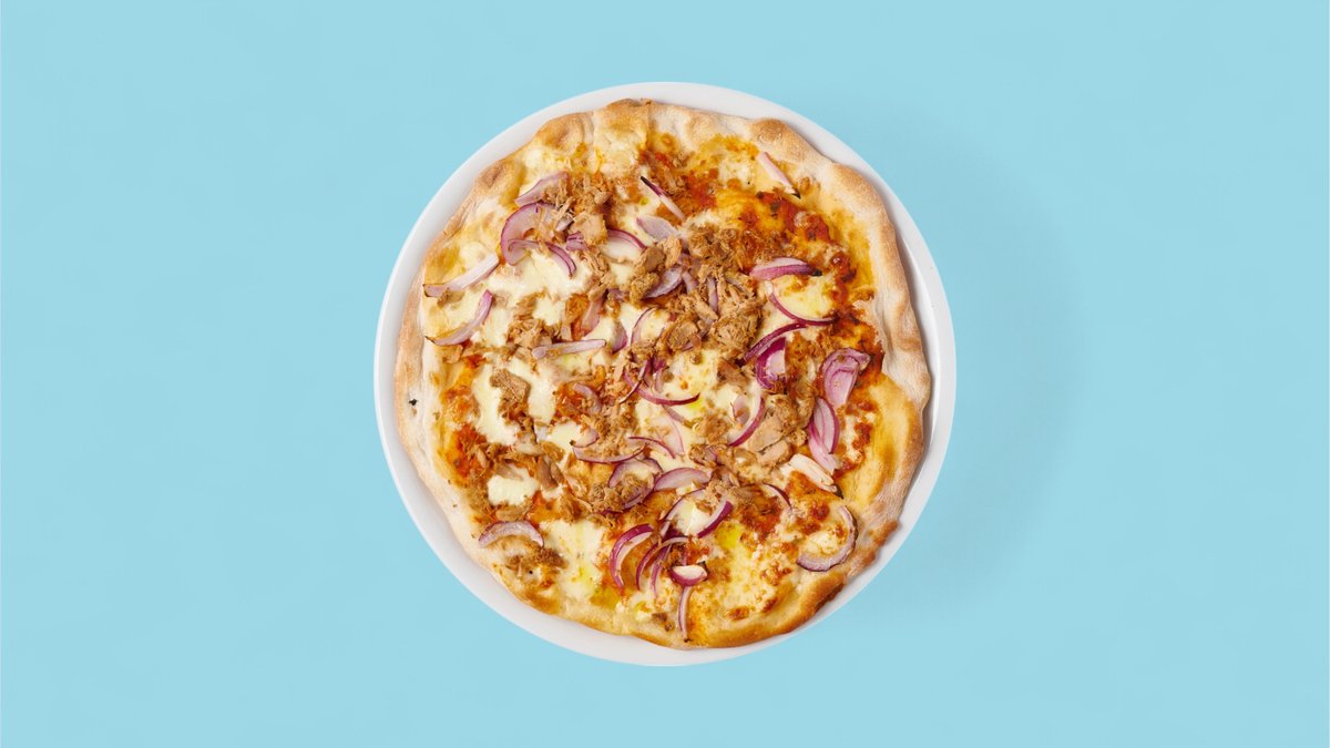 Genießen Sie unsere Tonno-Pizza mit saftigem Thunfisch, frischer roter Zwiebel, Tomatensauce und Mozzarella. 🍕
