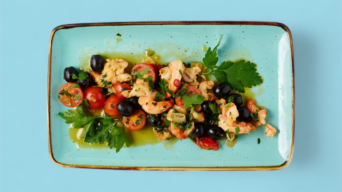 Scampi Aglio e Olio - Köstliche Garnelen mit schwarzen Oliven, Kirschtomaten, Pilzen, Knoblauch und Paprika. Perfekt als Antipasti oder Meeresfrüchte-Snack.