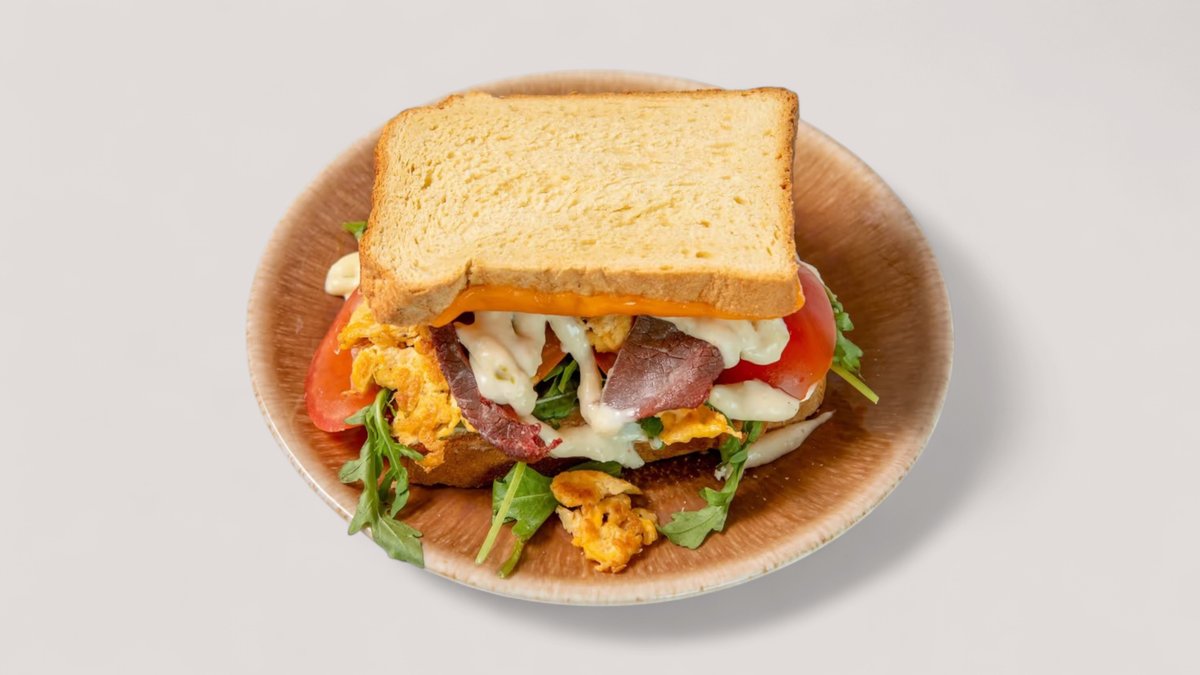mit Frischkäse, Rührei, knusprigem Rinderspeck, Salat und Tomaten