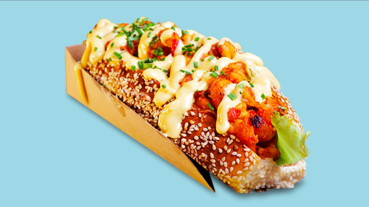 mit marinierten Black Tiger-Garnelen, roten Schmorzwiebeln, Salat und hausgemachter Aji-Amarillo Maracuja-Mayonnaise