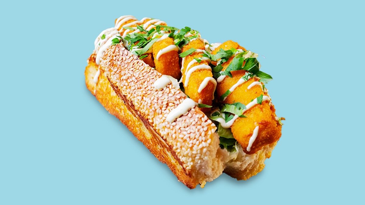 mit veganen Vischstäbchen, Zwiebeln, saurer Gurken, Salat und hausgemachter veganer Remoulade