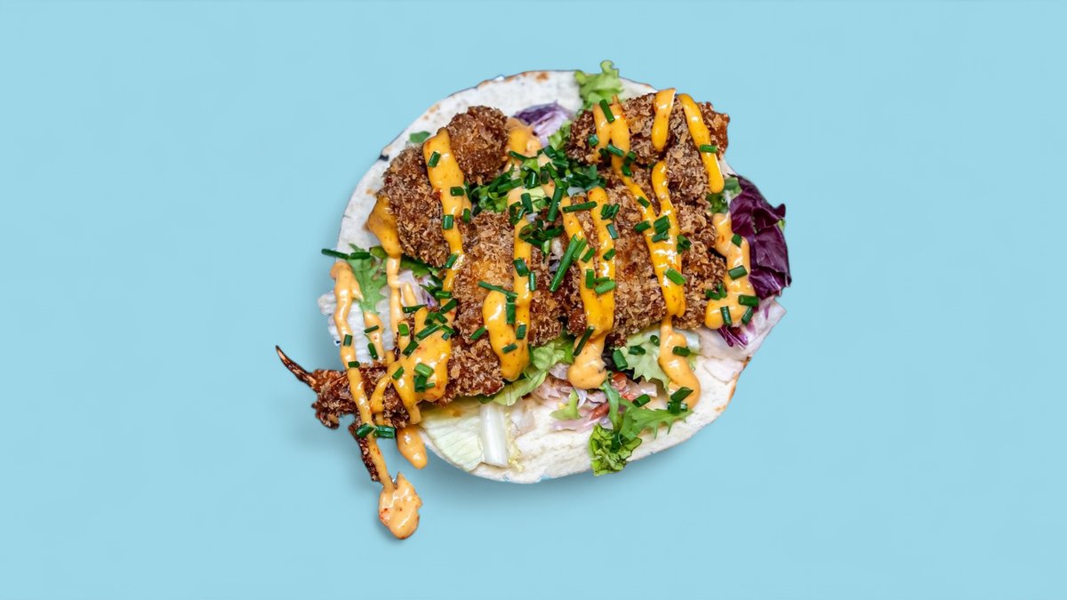 vegane „Vischstäbchen" mit frischem Salat, frischer Avocado Salsa und pikanter hausgemachter Sweet-Chili-Mayonnaise
