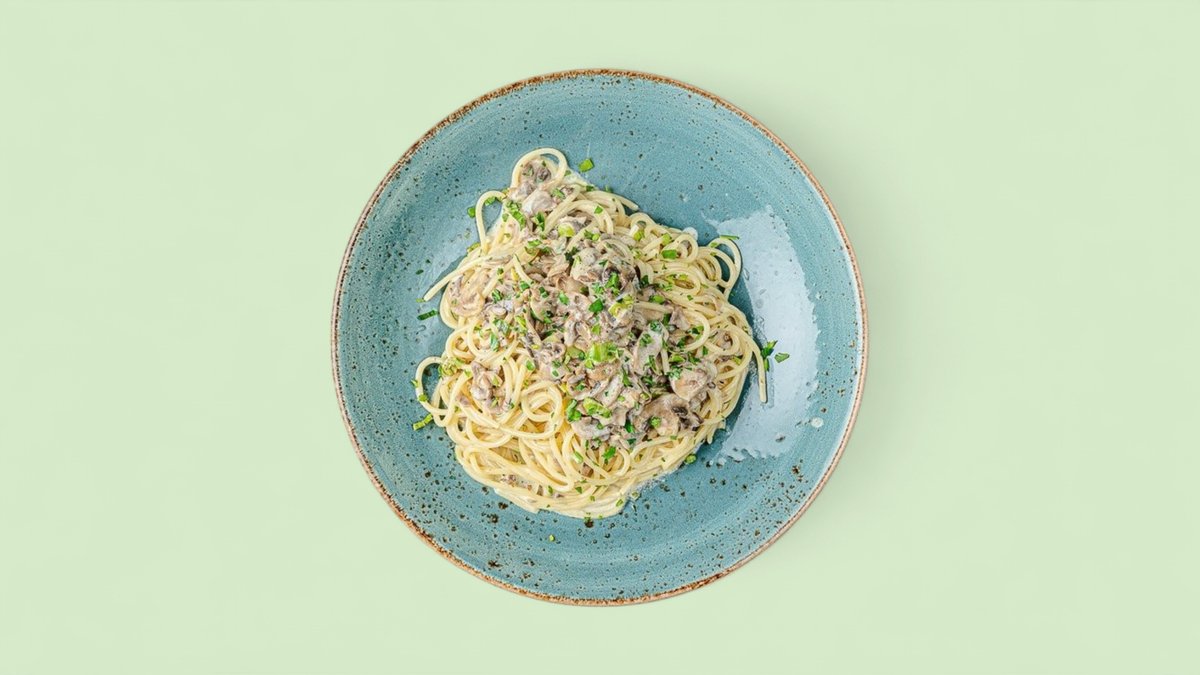 vegetarisch mit frischen Champignons, Lauchzwiebeln und Sahnesoße