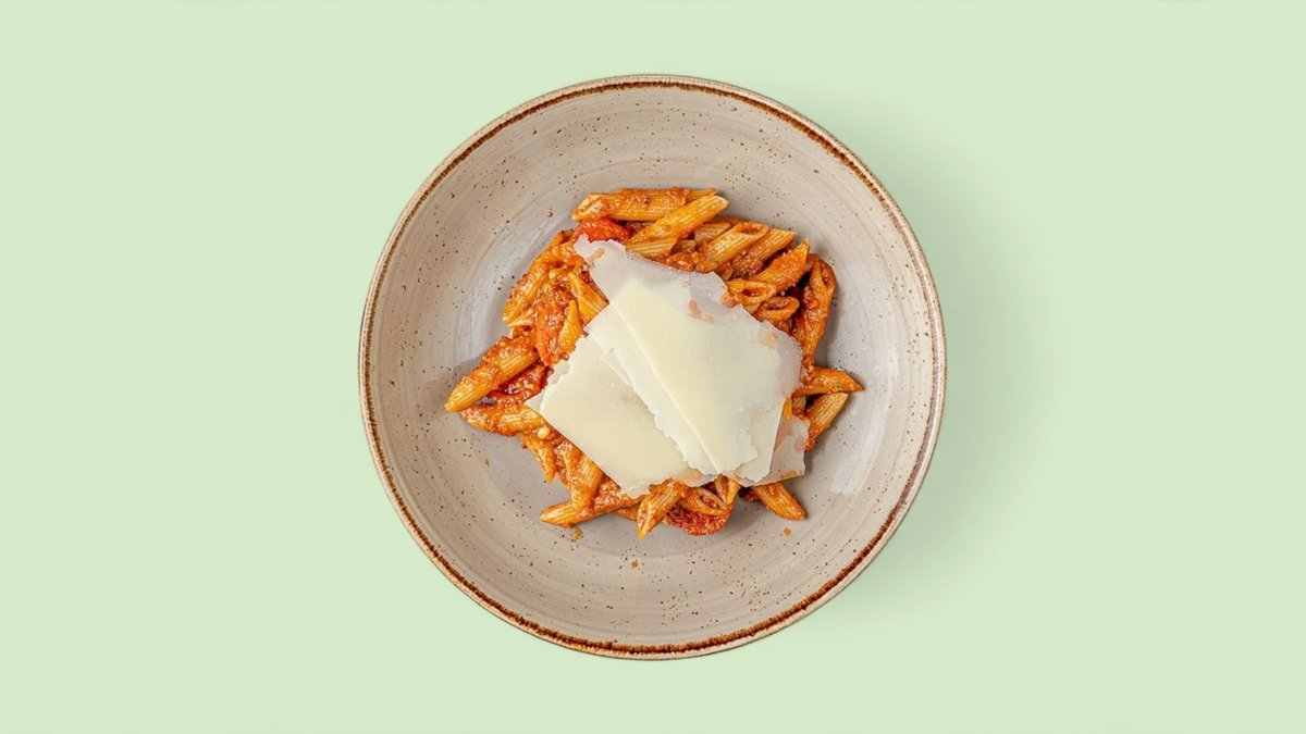 hausgemachte Pasta mit hausgemachten Rindfleischbällchen, Parmesan und Rucola, in fruchtig-pikanter Tomatensoße