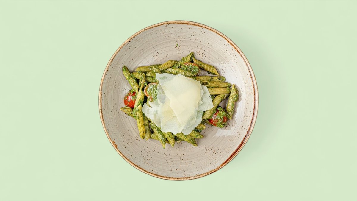 vegetarisch hausgemachte Basilikum-Pesto mit gerösteten Pinienkernen, Kirschtomaten und Parmesan