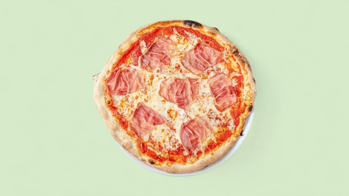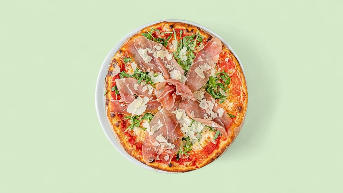 mit Rucola, Parmaschinken, gehobeltem Parmesan, Tomatensoße und Mozzarella