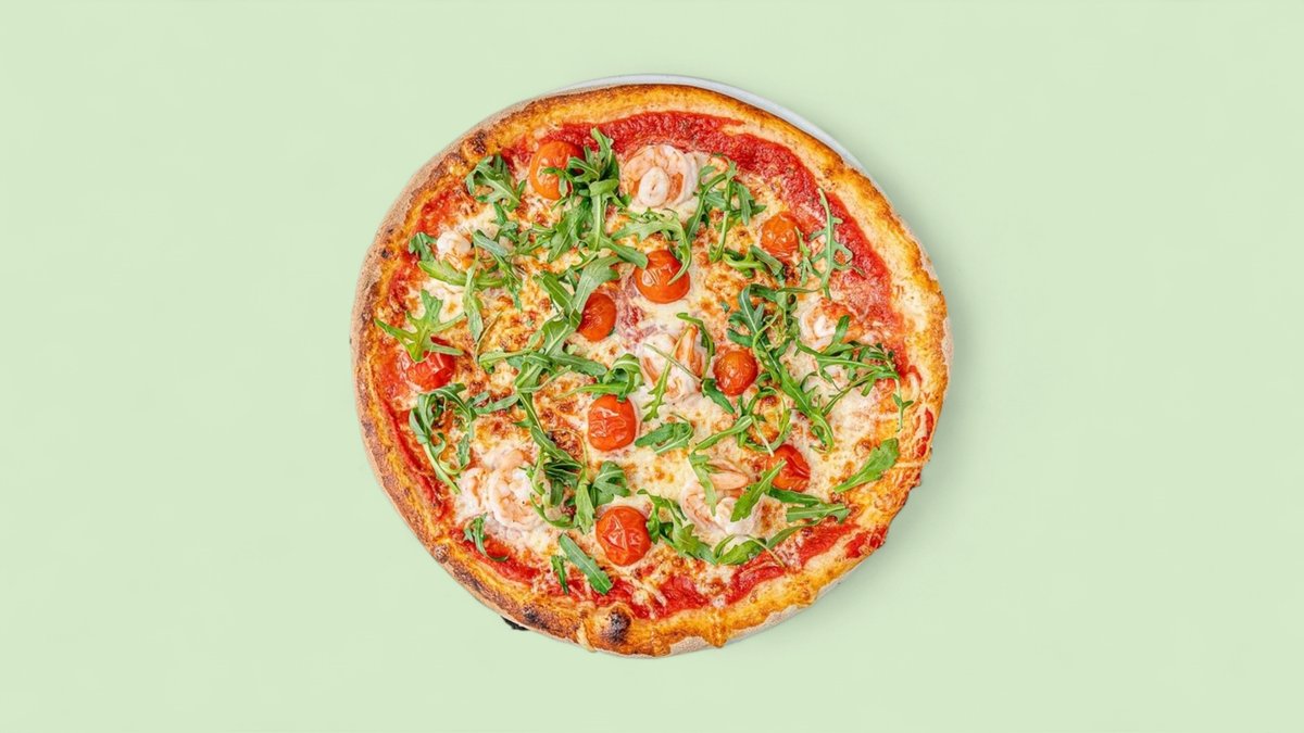 mit Riesengarnelen, Rucola, Kirschtomaten, Tomatensoße und Mozzarella