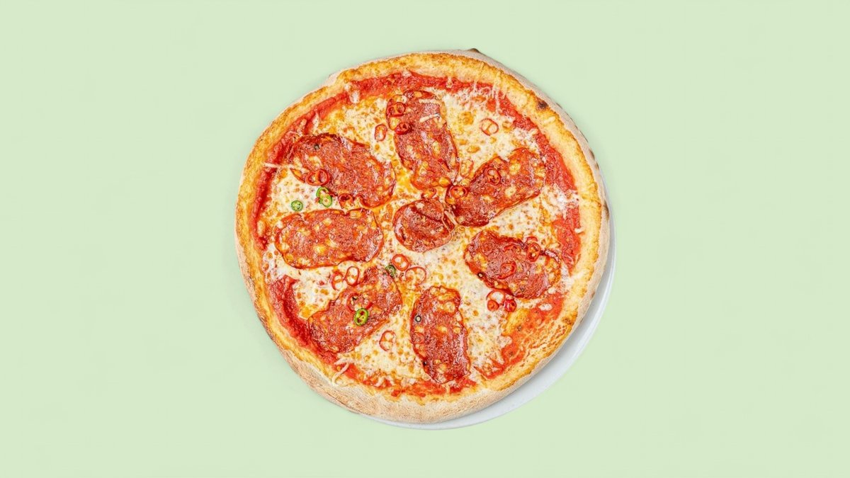 pikant mit pikanter Salami, Peperoni, Tomatensoße und Mozzarella