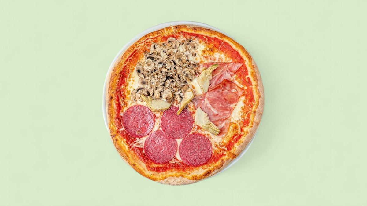 mit Schinken, Salami, frischen Champignons, Artischocken, Tomatensoße und Mozzarella