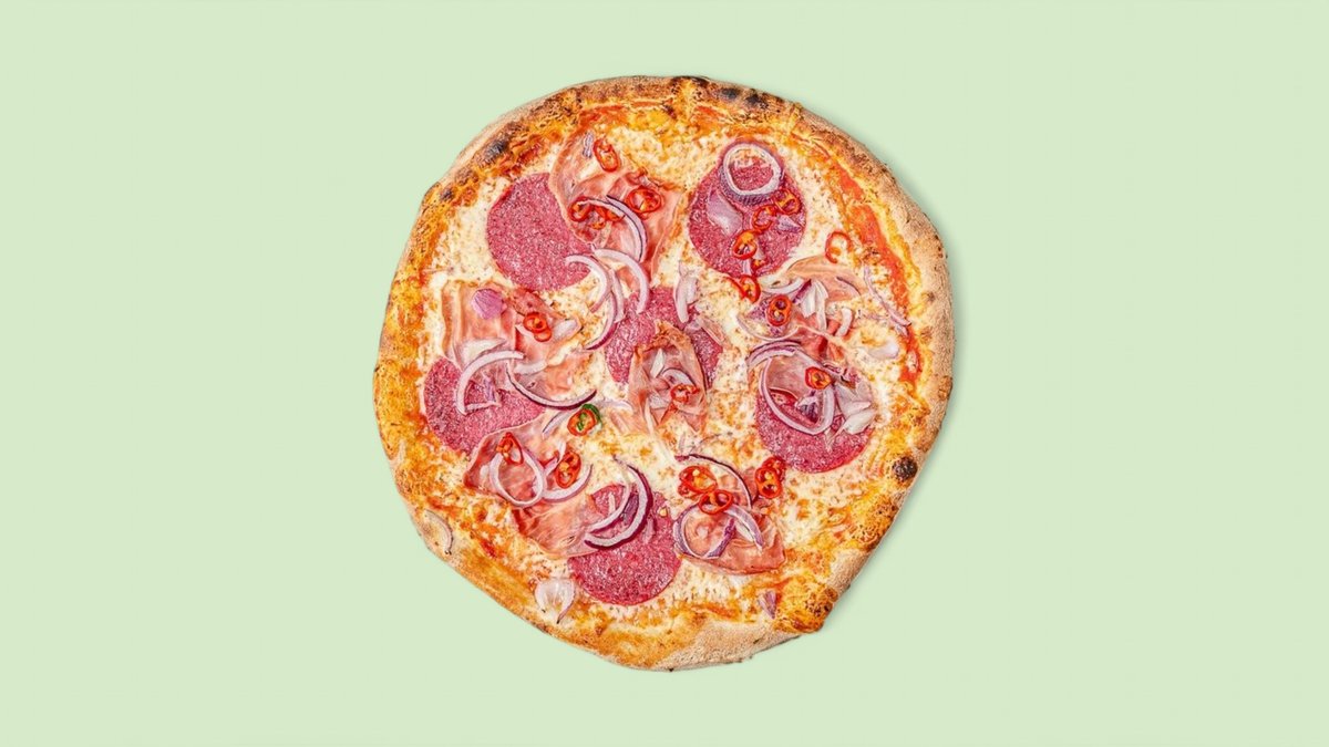 pikant mit Schinken, Salami, roten Zwiebeln, Peperoni, Tomatensoße und Mozzarella