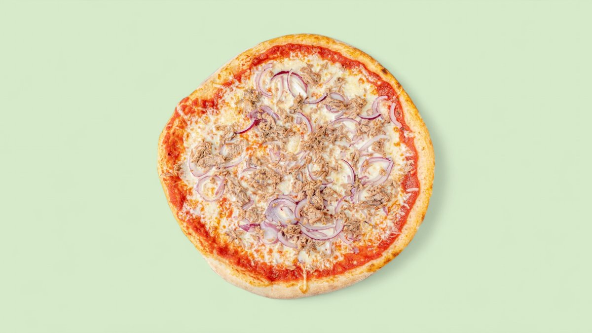 mit Thunfisch, roten Zwiebeln, Tomatensoße und Mozzarella