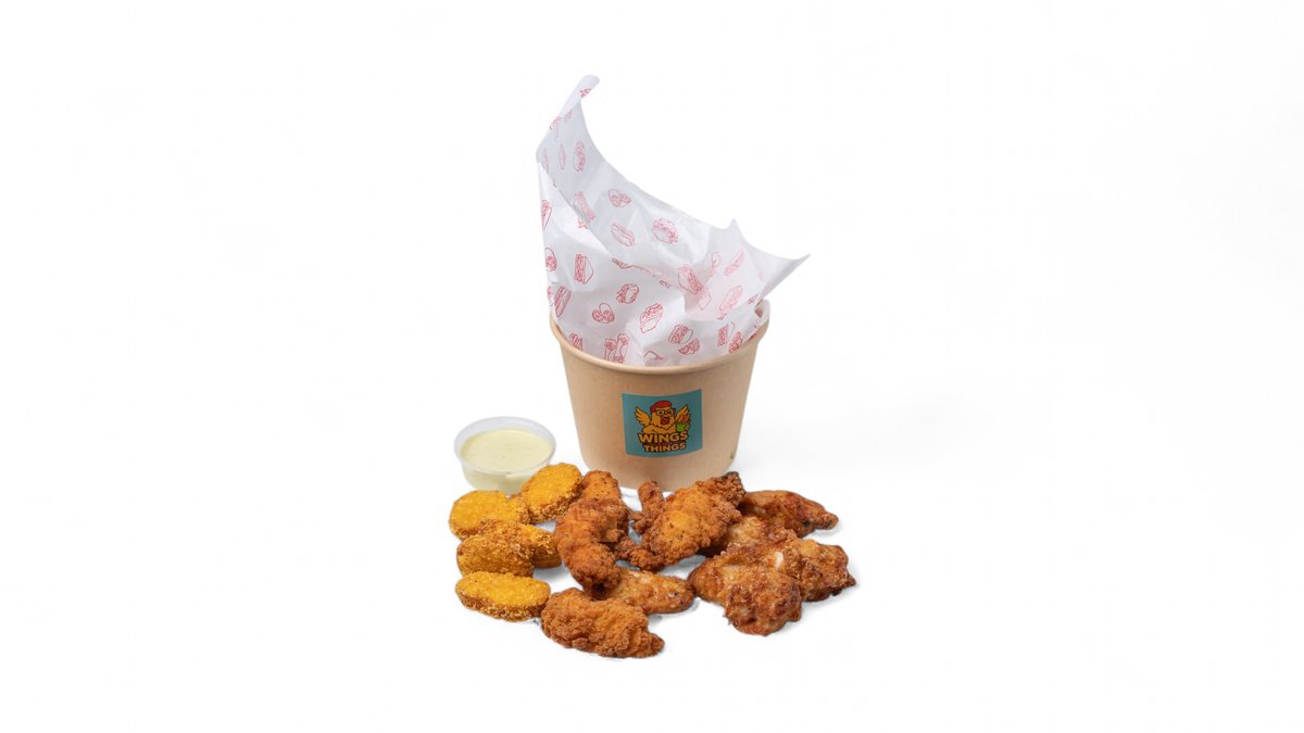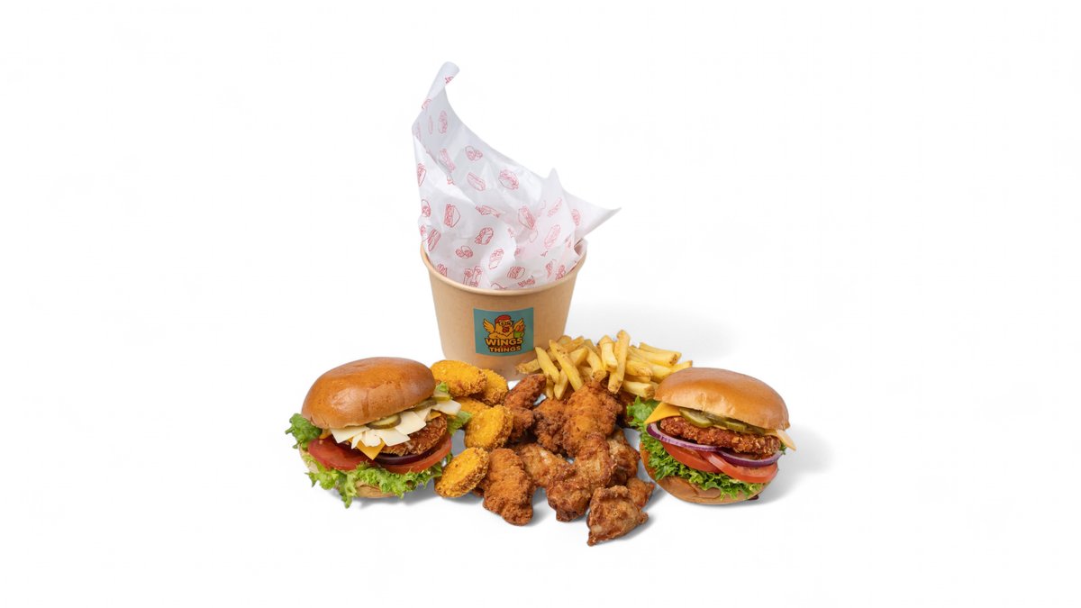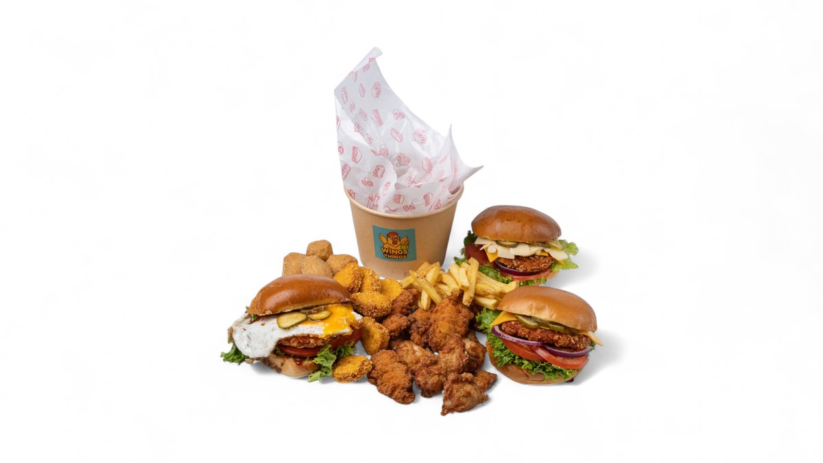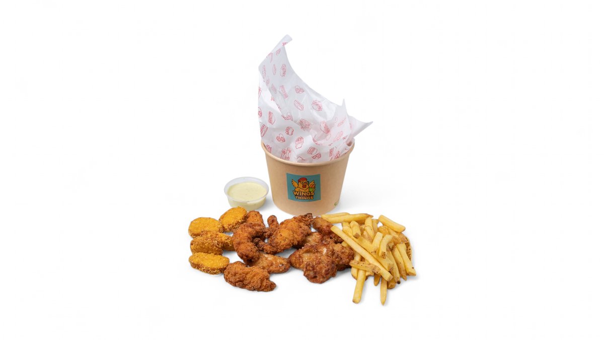 1 Ă— Crispy Burger, 1 Ă— Wings & Things Small-Bucket, 5 Ă— Chicken Nuggets, 5 Ă— Chicken Drums (Home Made Marinade), 5 Ă—Chicken Filets, 1 x SoĂźe nach Wahl