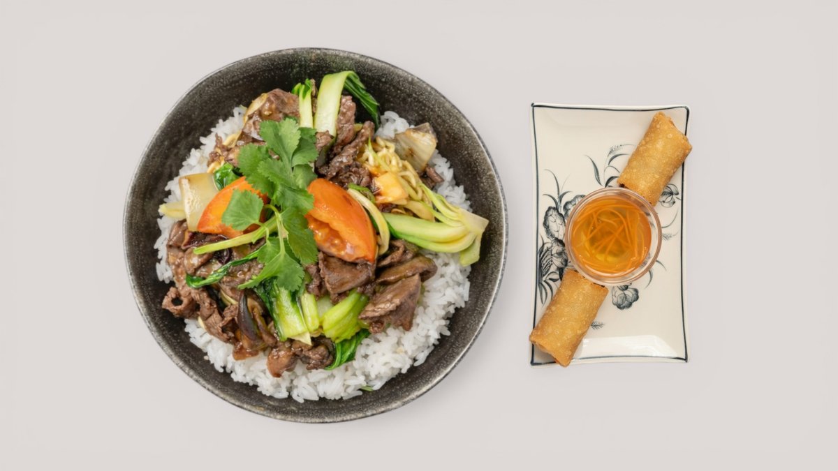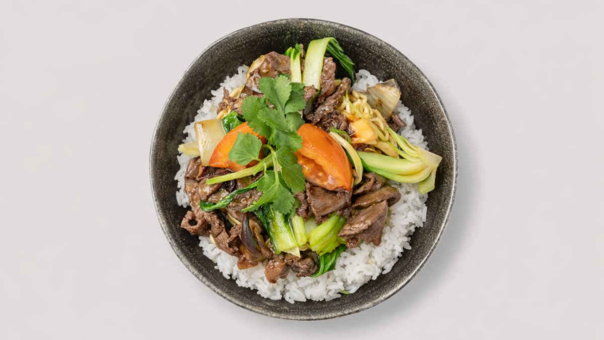 angebratenes Rindfleisch, Pak Choi in special Brat-Style, FrĂĽhlingszwiebeln und Koriander
