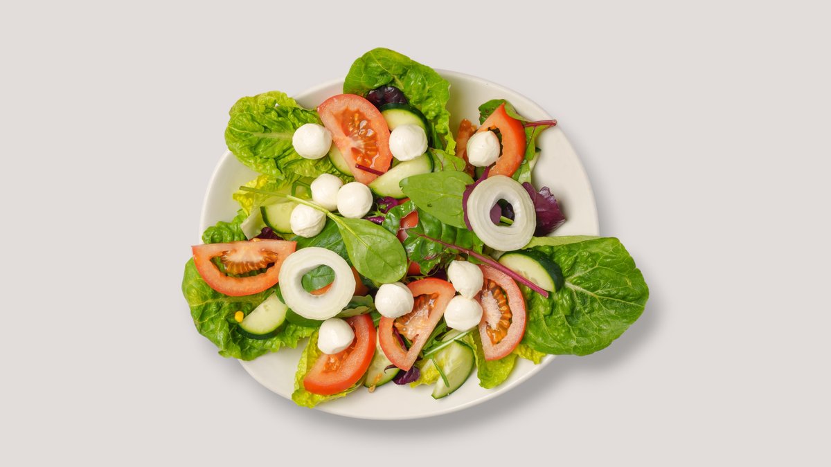 gemischter Salat mit Mozzarella, Zwiebeln, Oliven, Tomaten und Gurke