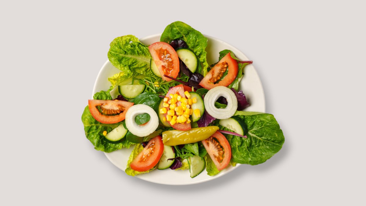 knackiger Mix aus Rucola, Mais, Zwiebeln, Peperoni, Tomaten und Gurke