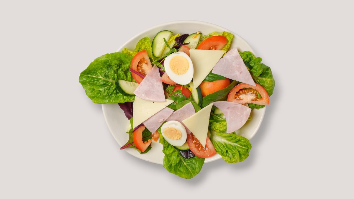 reichhaltiger gemischter Salat mit Ei, Hinterschinken vom Schwein, Käse, Tomaten und Gurke