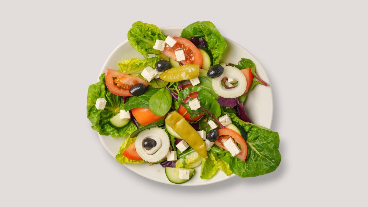 herzhafter gemischter Salat mit Hirtenkäse, Oliven, Peperoni, Zwiebeln, Tomaten und Gurke